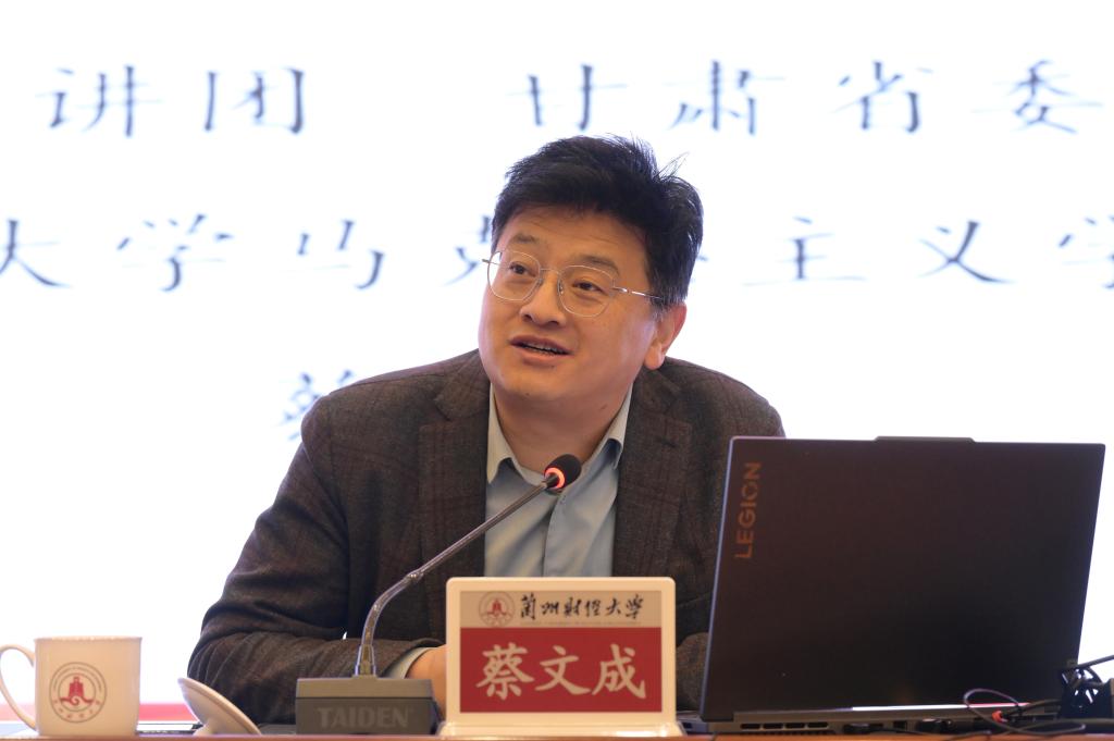 为全面深入学习宣传贯彻党的二十届四中全会精神,深入学习领会习近平总书记在全会上的重要讲话精神,根据省委教育工委统一安排,11月21日,全省教育系统“理响校园·培根铸魂”党的二十届四中全会精神宣讲暨校党委理论学习中心组(扩大)学习会议在和平校区兴隆讲堂举行。省委教育工委宣讲团成员、兰州大学马克思主义学院院长蔡文成应邀作辅导报告。宣讲报告会由校党委副书记滕宗骞主持。