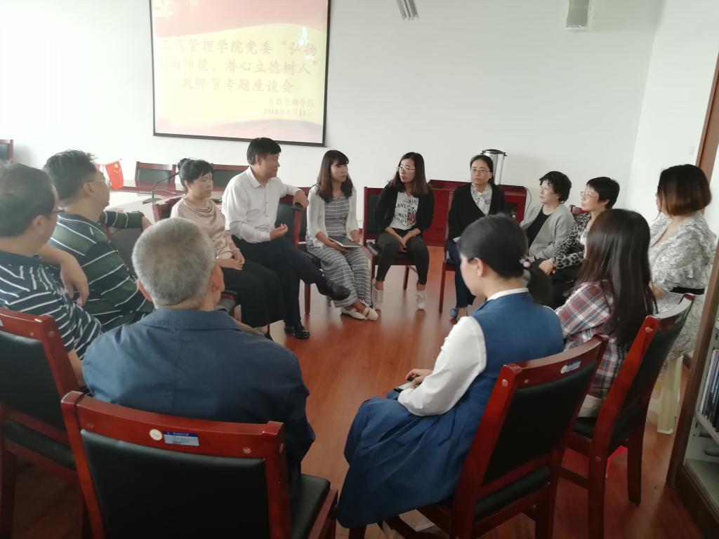 在迎接第34个教师节之际,为学习贯彻习近平新时代中国特色社会主义思想和党的十九大精神、全面落实《中共中央国务院关于全面深化新时代教师队伍建设改革的意见》精神,展现新时代广大教师坚守讲台、筑梦中国的新形象,营造弘扬高尚师德、潜心立德树人的新风尚,激励广大教师热爱教育,积极进取,开拓创新,推动学校及学院教育事业的全面发展。9月11日工商管理学院教工一支部、二支部全体党员在致远楼8号会议室举行“以学正心、以行争先、坚守讲台、筑梦中国”庆祝教师节专题座谈会。