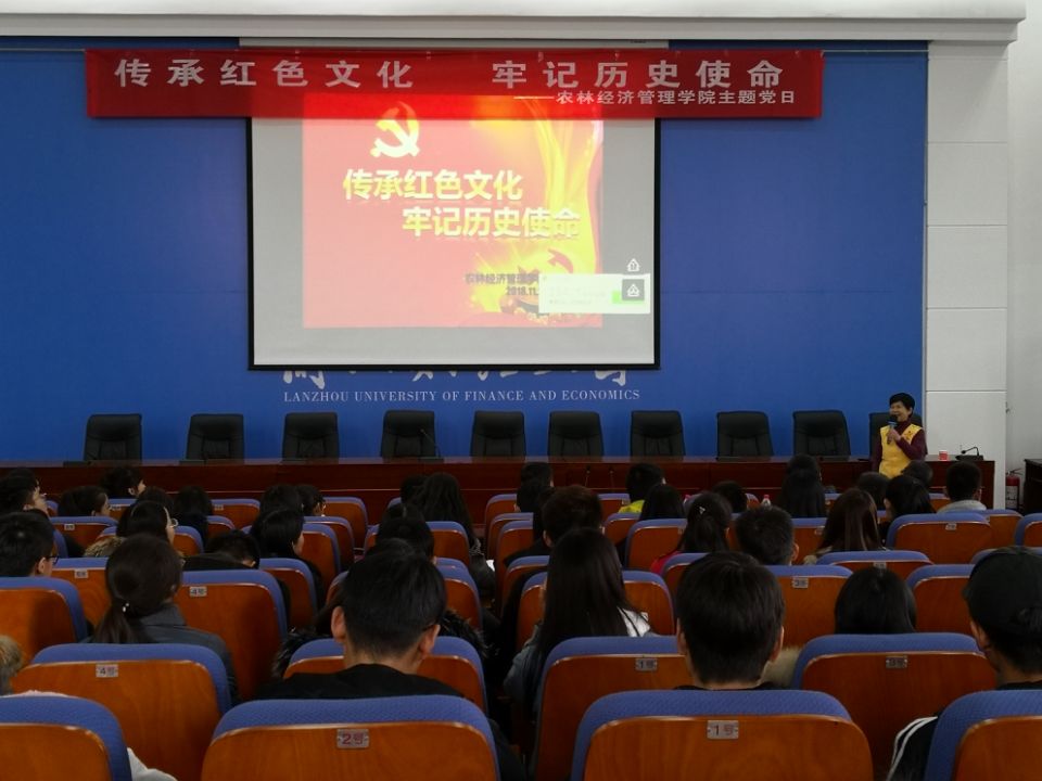 为了传承红色文化,弘扬爱国主义精神, 2018年11月27日下午,在树人楼报告厅,农林经济管理学院党委举办了“传承红色文化,牢记历史使命”主题党日活动。本次活动由甘肃省博物馆理事会理事、甘博志愿者翟乃越老师主讲,学院党委副书记曹一敏主持。农林经济管理学院全体教师、学生党员、入党积极分子、学生干部和学生代表等约300余人参加主题党日活动。
