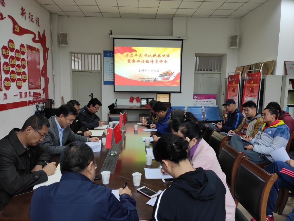 为深入学习宣传贯彻习近平总书记视察甘肃重要讲话精神,根据学校党委安排部署,10月15日上午在知行楼209会议室,副校长王必达为全体教职工宣讲习近平总书记视察甘肃重要讲话指示精神。