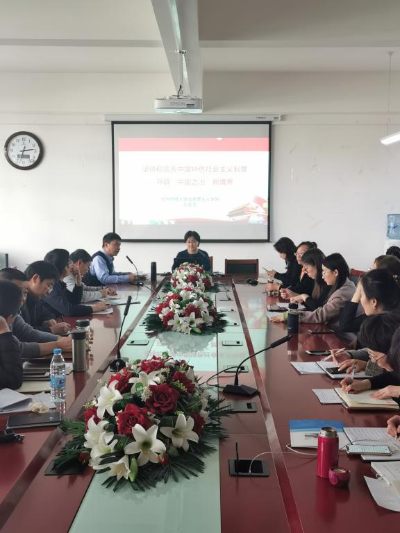 刘文玉说,中国特色社会主义制度是党和人民在长期实践探索中形成的科学制度体系,坚持和完善中国特色社会主义制度是首要政治任务。全体教职员工要充分认识其重大政治意义、现实意义和广泛而深远的影响,以实际行动体现对党绝对忠诚,学懂弄通做实习近平新时代中国特色社会主义思想,理论联系实际,把习近平新时代中国特色社会主义思想融入到我们的课堂教学中,真正学出坚定信念、学出绝对忠诚、学出使命担当。